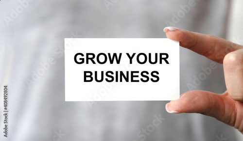 The girl holds a business card in front of her with the text GROW YOUR BUSINESS, the background is a gray T-shirt.