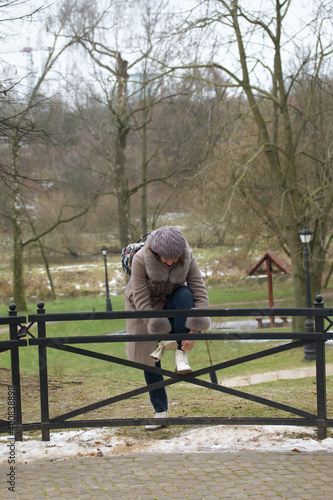 The girl walks in the park. Dressed in winter clothes. Adjusts the lace on the boot.