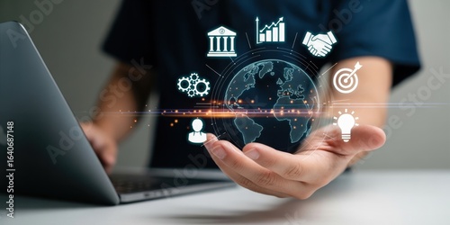 global, business, ecosystem, man, hand, glowing, earth, globe, icon, teamwork, innovation, goal, chart, handshake, cloud, computing, partnership, communication, corporate, management, development, success, vision, solution, abstract, leadership
