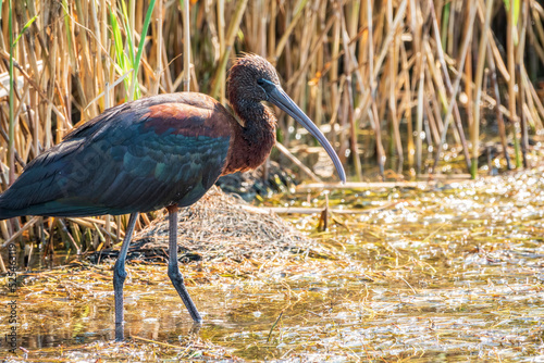 The glossy ibis, latin name Plegadis falcinellus, searching for food in the shallow lagoon.