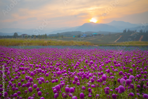 The Gomphrena Flower field of everlasting flowers surrounded by beautiful mountains in the evening during December to January at Phu Phan Ta, Ban Kha District, Ratchaburi