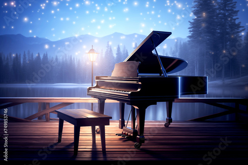 The grand piano on the wood pier in winter season with lake and snow mountains background at night time, the concept: a song about winter, music in winter