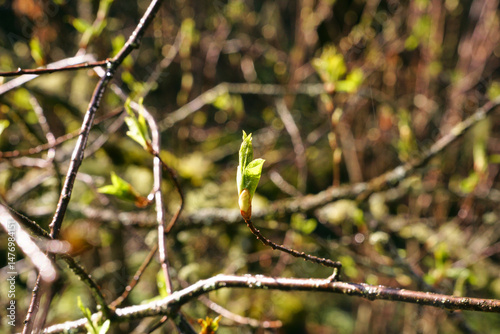 The green leaf of the tree in early spring, which comes out of the bud and grows on the branch. Spring buds are blooming
