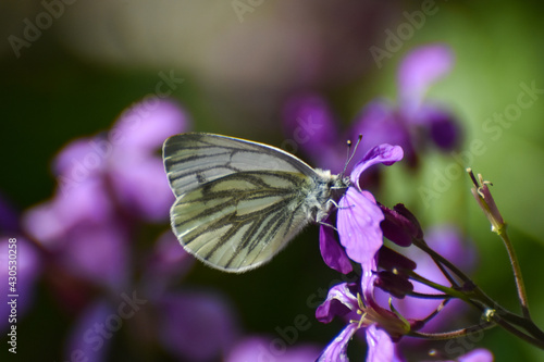 The green-veined white (Pieris napi) butterfly on wildflower. Natural background, big white butterfly on pink flower