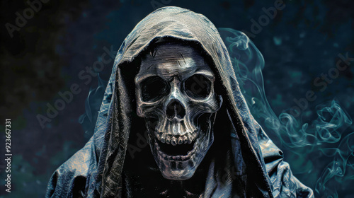 halloween, holiday, grim, reaper, skeleton, horror, fear, dark, cloak, creepy, character, screaming, skull, black, background, fright, terror, skittish, grisly, eerie, death, spectral, haunted, ghostly, concept, seasonal, house, october, night, ominous, chilling, ghastly, silvery, figure, gaze, supernatural, metaphoric, shadow, moody, intense, dramatic, design, fantasy, imagination, folklore