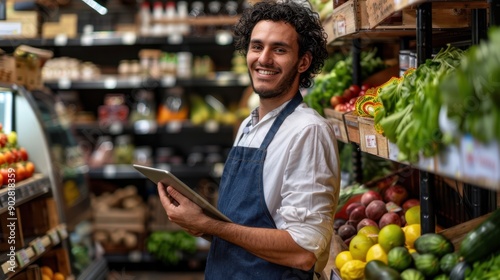 happy, smile, professional, man, business, people, technology, vegetable, businessman, shopping, food, smiling, shop, digital, men at work, fresh, supermarket, market, grocery, young, healthy, apron, store, male, shelf, tablet, indoor, produce, staff, retail, client, organic, grocer, local, distribution, occupation, freshness, service, friendly, personnel, clerk, assistant, salesperson