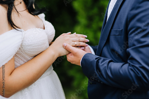 The groom in a blue suit and the bride in a white dress stand at the ceremony holding hands with a gold ring on their finger. Close-up wedding photography, portrait.