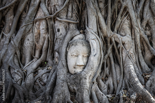 The head of a Buddha image in an old tree root at Wat Mahathat is the famous and famous landmark of Ayutthaya Province, Thailand.