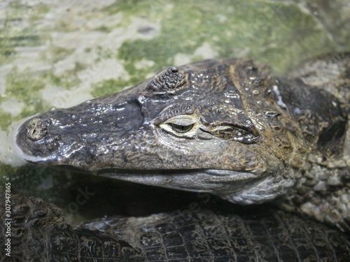 The head of a crocodile with large sharp teeth and open eyes lying in a terrarium waiting for food.