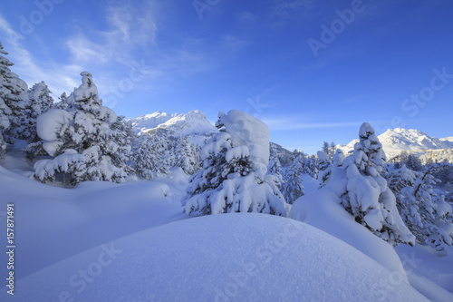 The heavy snowfall covered trees and the peaks around Maloja Canton of Graubünden Engadine Switzerland Europe
