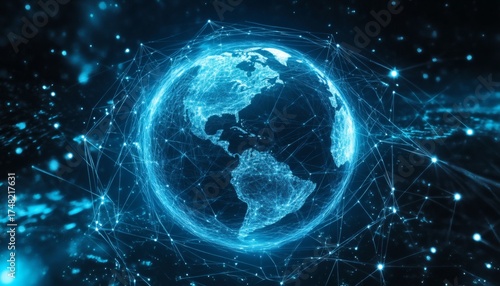 The illustration depicts a digital rendering of the Earth, with glowing blue lines connecting various points on its surface, symbolizing a global network.