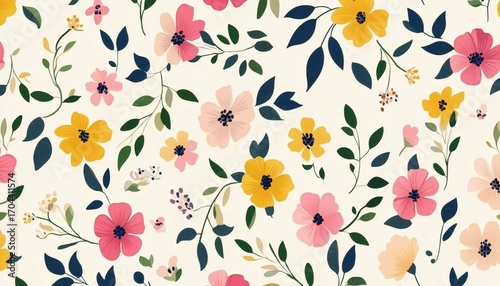 The illustration shows a repeating pattern of stylized flowers and leaves in shades of pink, yellow, orange, and dark green against a bright white backdrop.