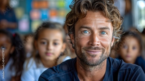 The image captures a man with a genuine smile, with unfocused children sitting in the background suggesting a classroom setting