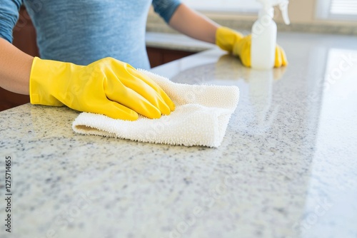 The image depicts a house maid in a positive demeanor, donning a dotted apron, using yellow gloves and a blue cloth to clean a kitchen desktop