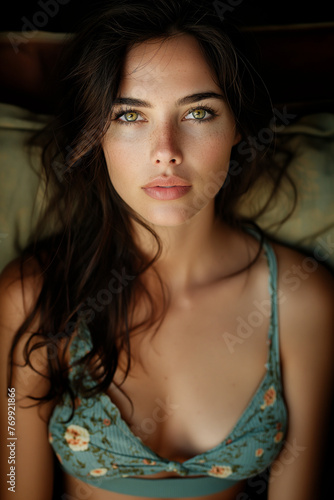 The image depicts a young beautiful brunette woman waking up in bed in the morning.