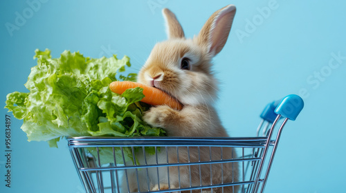 The image features an adorable white bunny sitting next to a shopping cart filled with fresh vegetables, including carrots and lettuce, set against a blue background. The bunny is in the act of eating