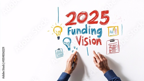 The image features hands crafting a vision statement for 2025, focusing on funding, innovations, and future plans illustrated through colorful icons.