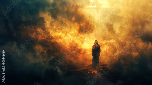 The image has contrasting dark and light areas, with orange and yellow prominent in the center. At the top center is a glowing cross, symbolizing religion.