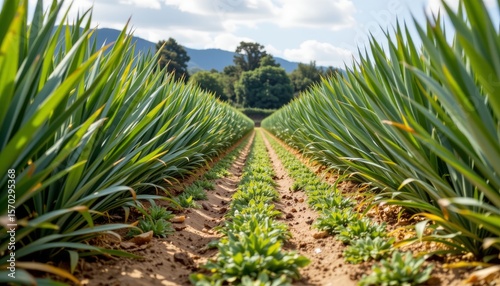 the image presents a neatly organized field with rows of spiky, green plants stretching into the distance