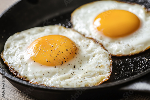 The image showcases two sunny-side-up eggs in a cast iron skillet. The yolks are bright orange, surrounded by a perfectly cooked white, seasoned with black pepper, creating an appetizing appearance.