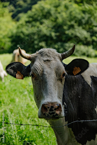cow, black-and-white, pasture, rural, countryside, farm animal, animal, farm, grazing, grass, dairy cow, horn, agriculture, nature, cattle, herd, farming, peaceful, serene, summer, greenery, bovine, wildlife, rustic, dairy farming, natural light, insect, farm animal, tranquil, animal portrait