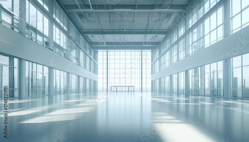 office, interior, modern, architecture, building, window, glasses, bright, light, space, room, empty, large, design, contemporary, style, clean, minimal, industrial, beam, ceiling, floor, polished, white, cyan, blue, daylight, open, plan, view, perspective, line, geometric, shape, structure, professional, corporate, business, commercial, stark, simple, wide, high