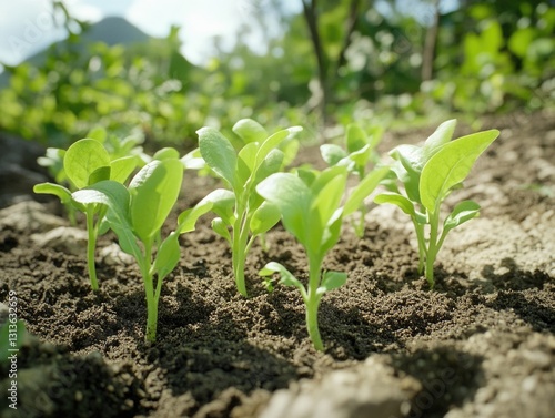 The image shows a garden bed being prepared for planting green vegetables. The soil has been turned and weeded, and the seeds have been sown in rows.