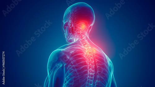 The image shows an X-ray visualization of the upper human body, focusing on the neck and spine. A red glow highlights the area of potential pain or injury in the neck region