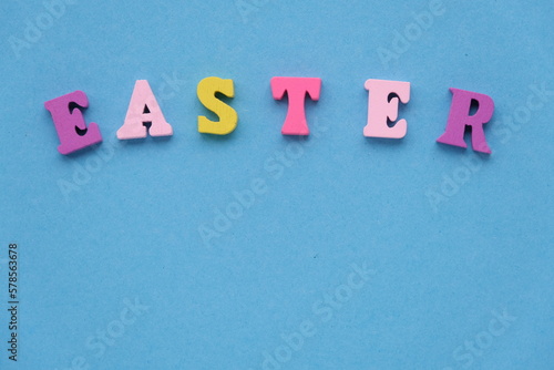 The inscription Easter from wooden colored letters on a light blue background. Flat lay, copy space
