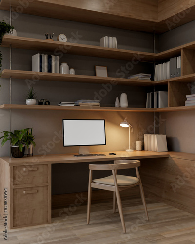 The interior design of a contemporary woody home office features a computer mockup on a wooden desk.