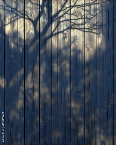 The intricate shadows of a leafy tree dance across a rustic wooden fence, creating a beautiful interplay of light and dark that highlights the texture of the wood.