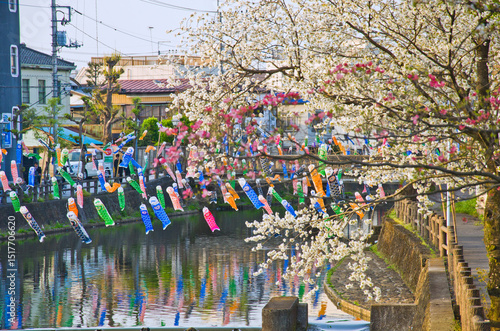 The Japanese Carp Fish Flags at the Uzumagawa River in Tochigi town, Tochigi prefecture, Kanto, Japan.
