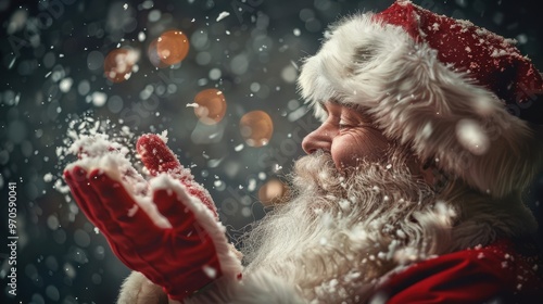 cosy, winter, christmas, celebration, hand, bokeh, light, snow, portrait, holiday, smiling, santa, festive, happiness, joy, cheerful, red, beard, fun, hat, warmth, magic, glove, peaceful, serene, seasonal, tradition, atmosphere, nostalgia, ambience