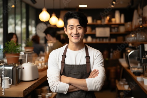 korean, male, owner, modern, cafes, happy, good, sale, portrait, barista, waiter, service, smile, occupation, apron, business, employee, standing, man, eatery, looking, cafeteria, staff, shop, professional, counter, job, cheerful, working, bar, entrepreneur, hot drink, confident, caucasian, store, drink, happiness, indoor, espresso, men at work, crossed, profession, photogenic, horizontal, making, manager, machine, cup, retail