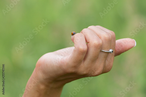 up, coccinellidae, hand, female, manicure, finger, beautiful, green background, support, somebody