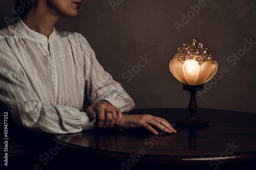 anonymous, art, dark, finger, furniture, glasses, hand, holding, indoor, lamp, light, lighting, lip, portrait, retro, room, shirt, sphere, table, texture, vintage, white, woman