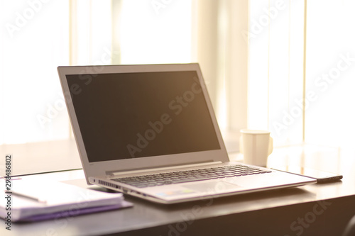 The laptop is placed on the table with a notebook and a smartphone.Technological equipment for working on wooden tables and orange lights.