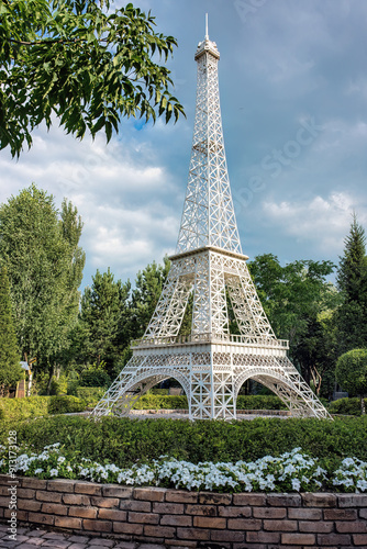 The layout of the Eiffel Tower is surrounded by trees and flowers against the background of the cloud sky.