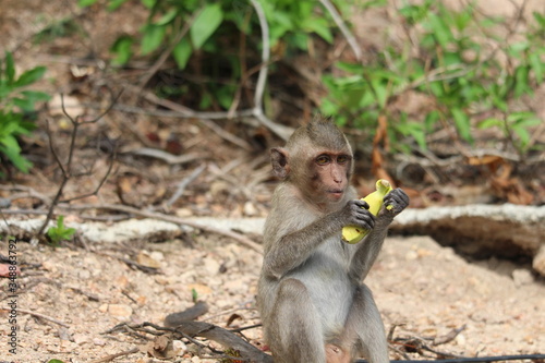 The little monkey eating a banana at Bangsaen Khao Sam Muk