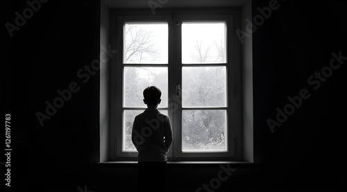 window, boy, girl, back, loneliness, black-and-white, fog, melancholy, childhood, family, indoor, waiting, loss, shadow, gaze, light