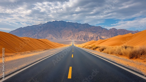 The long straight road in the desert stretched endlessly, flanked on either side by rolling sand dunes that shimmered in the intense heat of the sun
