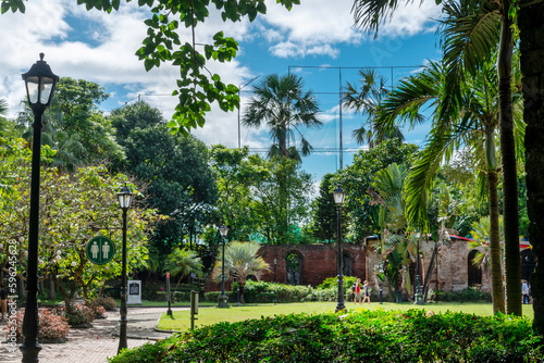 manila, philippines, garden, grass, pathway, landscaped, ruin, lawn, wall, ancient, historic, plant, destination, greenery, tree, spanish, holiday maker, vacation, colonial, modern, ruined, defensive, building, lamp, inside, architectural, fort, landmark, site, sky, cloud, within, vacation, filipino, architecture, travel, city, protection, courtyard, location, adventure, traveling, earth