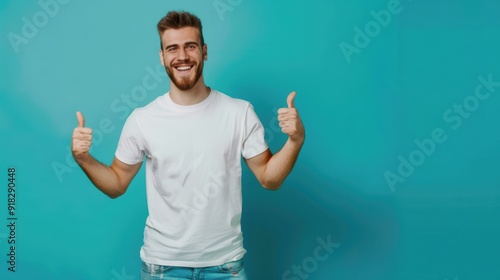 man, joyful, joy, happy, portrait, happiness, studio, person, smile, confident, fun, cheerful, fashion, casual attire, jean, face, thumb, t-shirt, blue, bearded, excited, model, modern, energetic, male, positive, expression, background, casual clothes, alone, white, stylish, successful, standing, enjoyment, isolated, friendly, trendy, fashionable, attitude, optimistic, charismatic, striking, inspired
