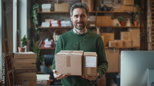 home, smiling, man, office, business, beard, casual attire, happy, delivery, warehouse, men at work, green, logistic, client, indoor, entrepreneur, market, sweater, shipping, owner, service, working, store, storage, mail, inventory, shelf, package, cardboard, retail, box, equipment, holding, plant, small, startup, order, workplace, online, occupation, e-business, company, fulfillment, preparing, self employed