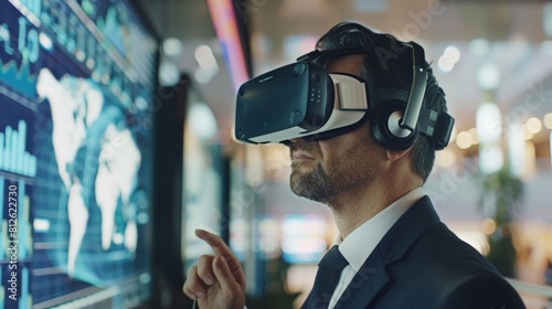man, wear, headset, look, display, use, virtual, reality, simulation, alternate, businessman, therapy, manufacture, enhance, augment, explore, technology, tour tourism, vision, cyber, generate, engineering, design, sensory, interface, device, education, architecture, fantasy, retail, interact, computer, life events, involvement, entertainment, innovation, visual
