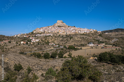 The medieval city of Morella with its walls and the castle on top of the mountain, Morella, Castellon, Spain