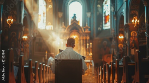 The minister guides his congregation in prayer, reads from the Holy Book, The Bible, the Gospel of Jesus. The priest's portrait gives hope to the faithful people. Dramatic cinematography.