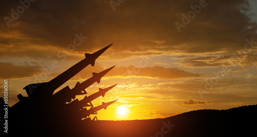 The missiles are aimed to the sky at sunset. Nuclear bomb, chemical weapons, missile defense, a system of salvo fire.