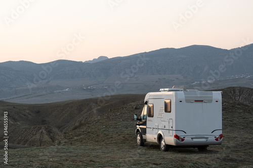 The motorhome. A house on wheels. Camper. Rv. The car is in the background of the sunset.