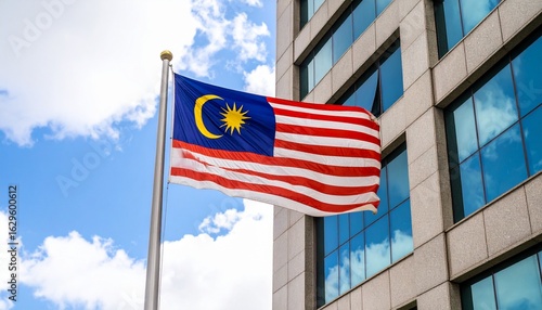The national flag of Malaysia, Jalur Gemilang, waving on a flagpole next to a modern office building.